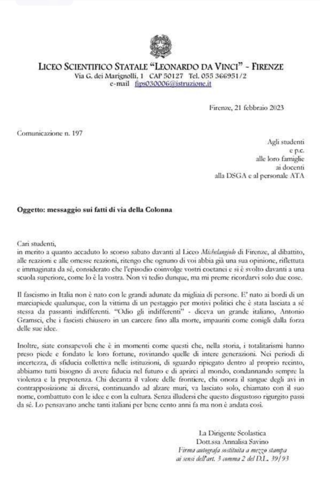 La lettera della preside di Firenze agli studenti - Tiscali Notizie Annalisa Savino, preside dello scientifico "Leonardo da Vinci" scrive ai suoi studenti per ricordare loro come è nato il fascismo e con quali armi si combatte. La preside Annalisa Savino (Ansa)