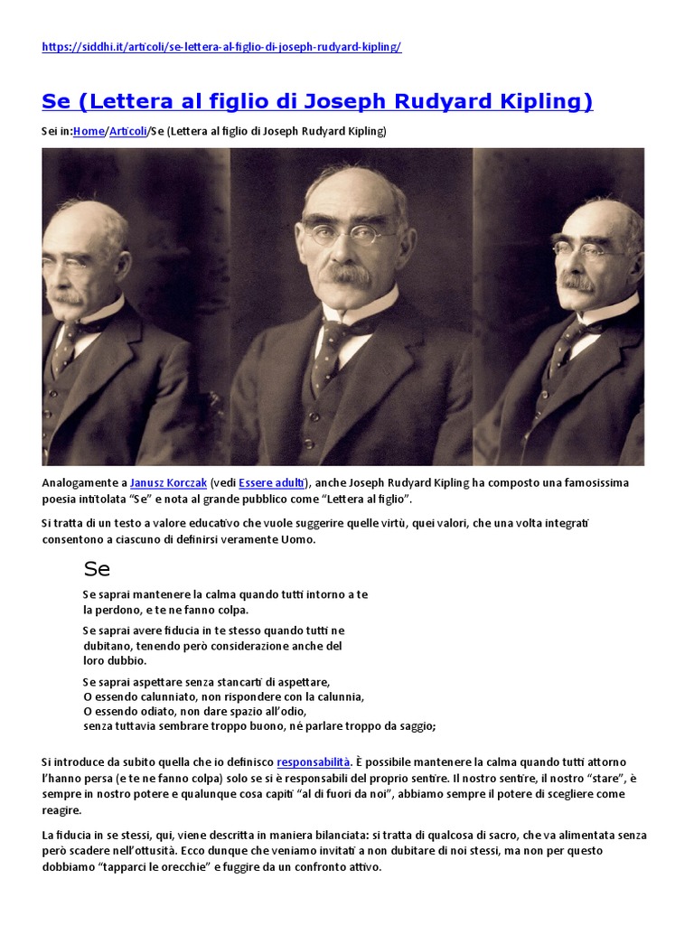 Joseph Rudyard Kipling, lettera al figlio: "If..." - laCOOLtura Il messaggio di Kipling è chiaro: vivere con pienezza la propria vita non è facile, ogni situazione va interpretata rispettando alcune regole interiori, l'umiltà, la pazienza, il coraggio, la tenacia, la sincerità, un giusto equilibrio fra immaginazione, sentimento e razionalità.
